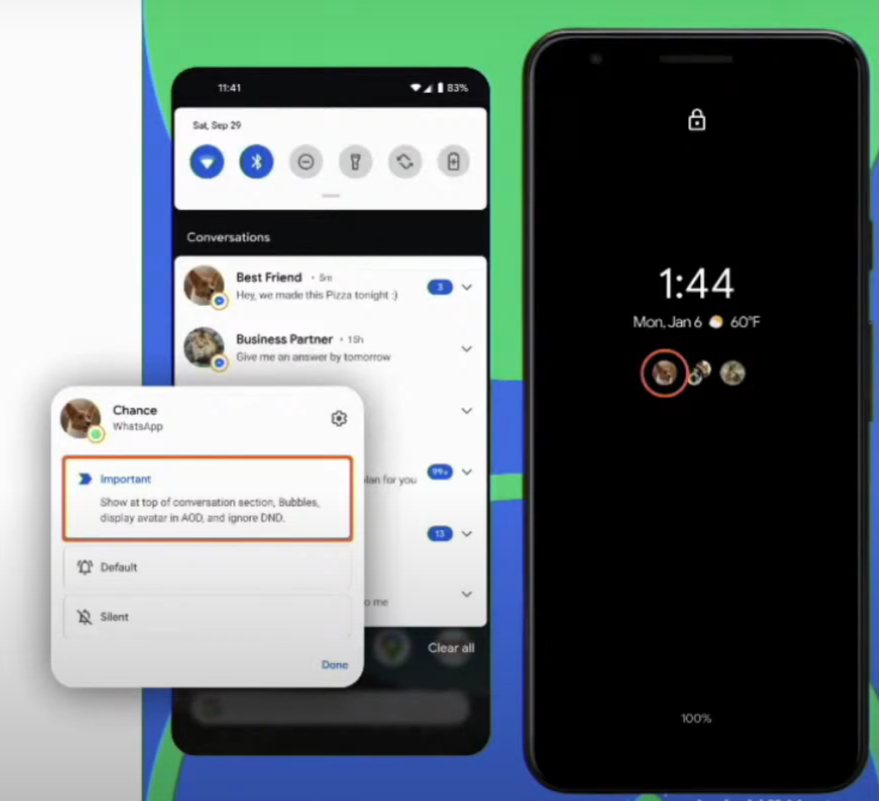 > 중요 대화 : 중요 대화를 설정할 경우 '방해 금지' 무시, AOD 상에 아이콘 형태로 표시
