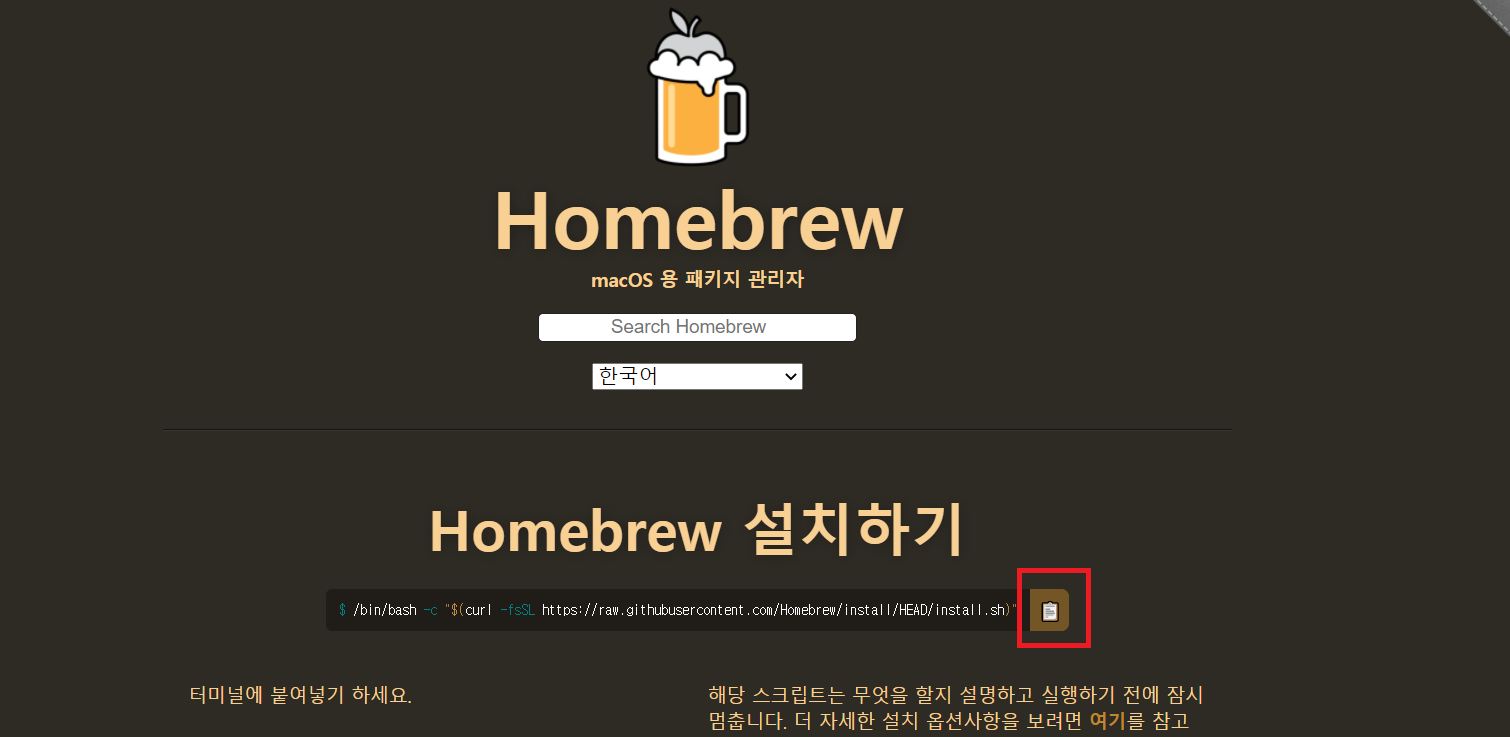 Homebrew 공식 홈페이지 접속 후 아래 버튼을 선택 할 경우 명령어가 복사됩니다.