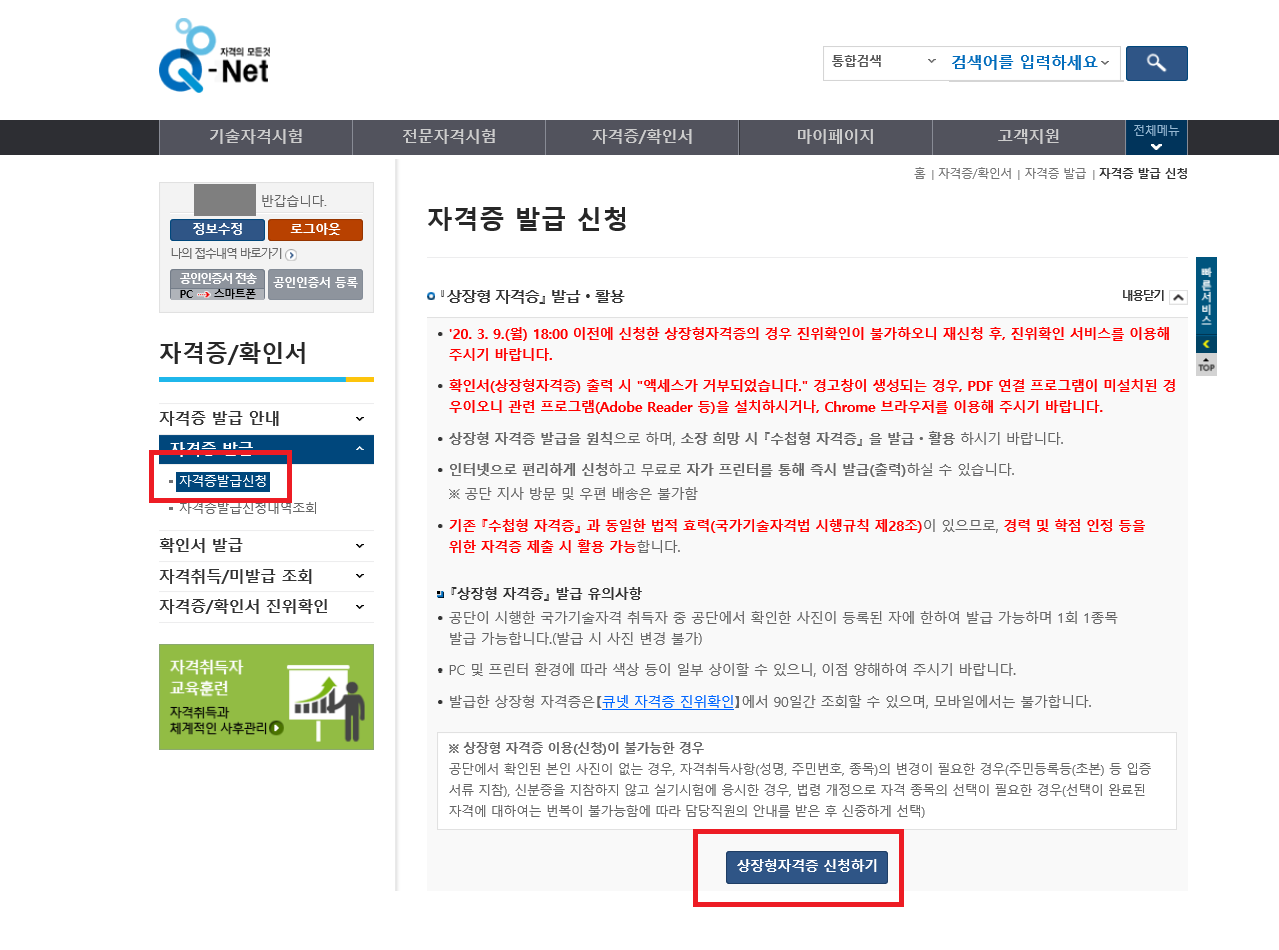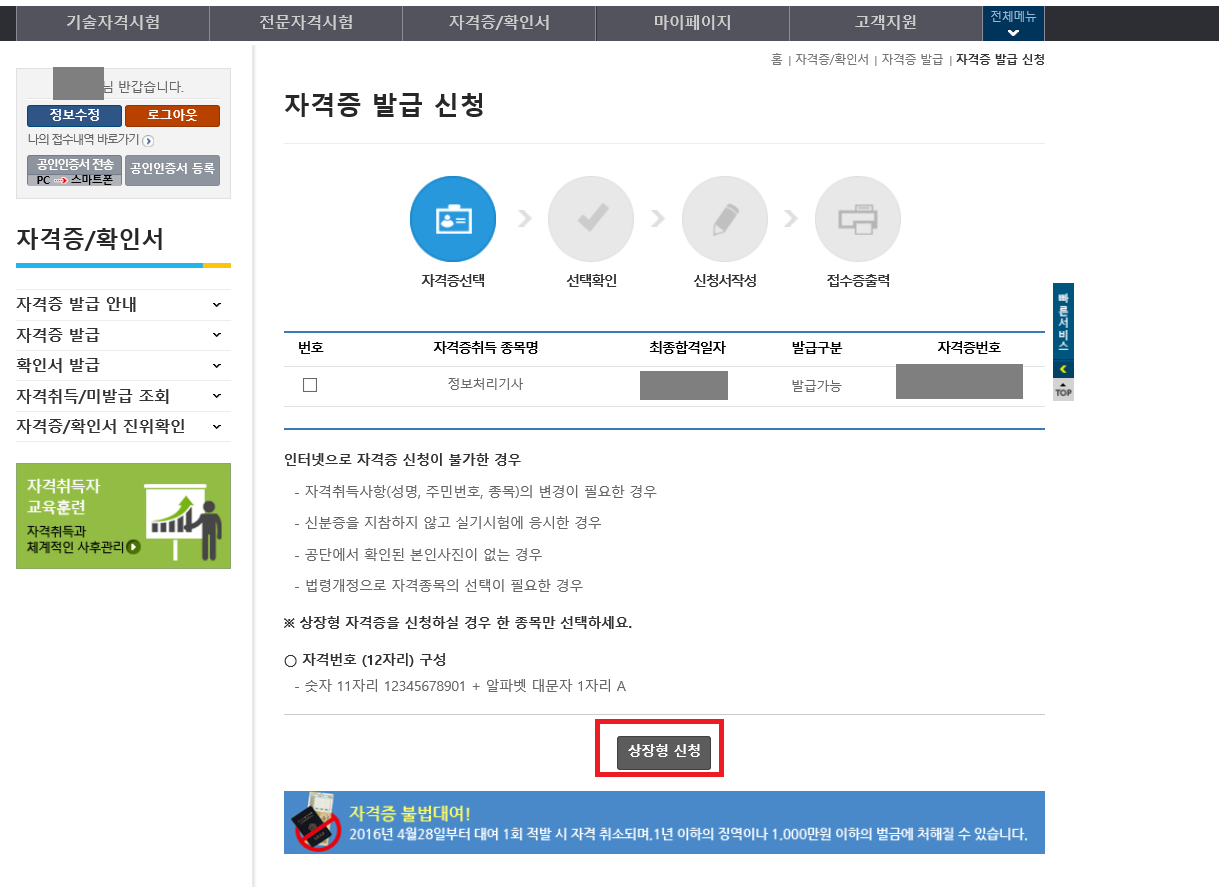 자격증 발급 신청 내역 개인 정보 및 개인 정보 확인 후 출력하기