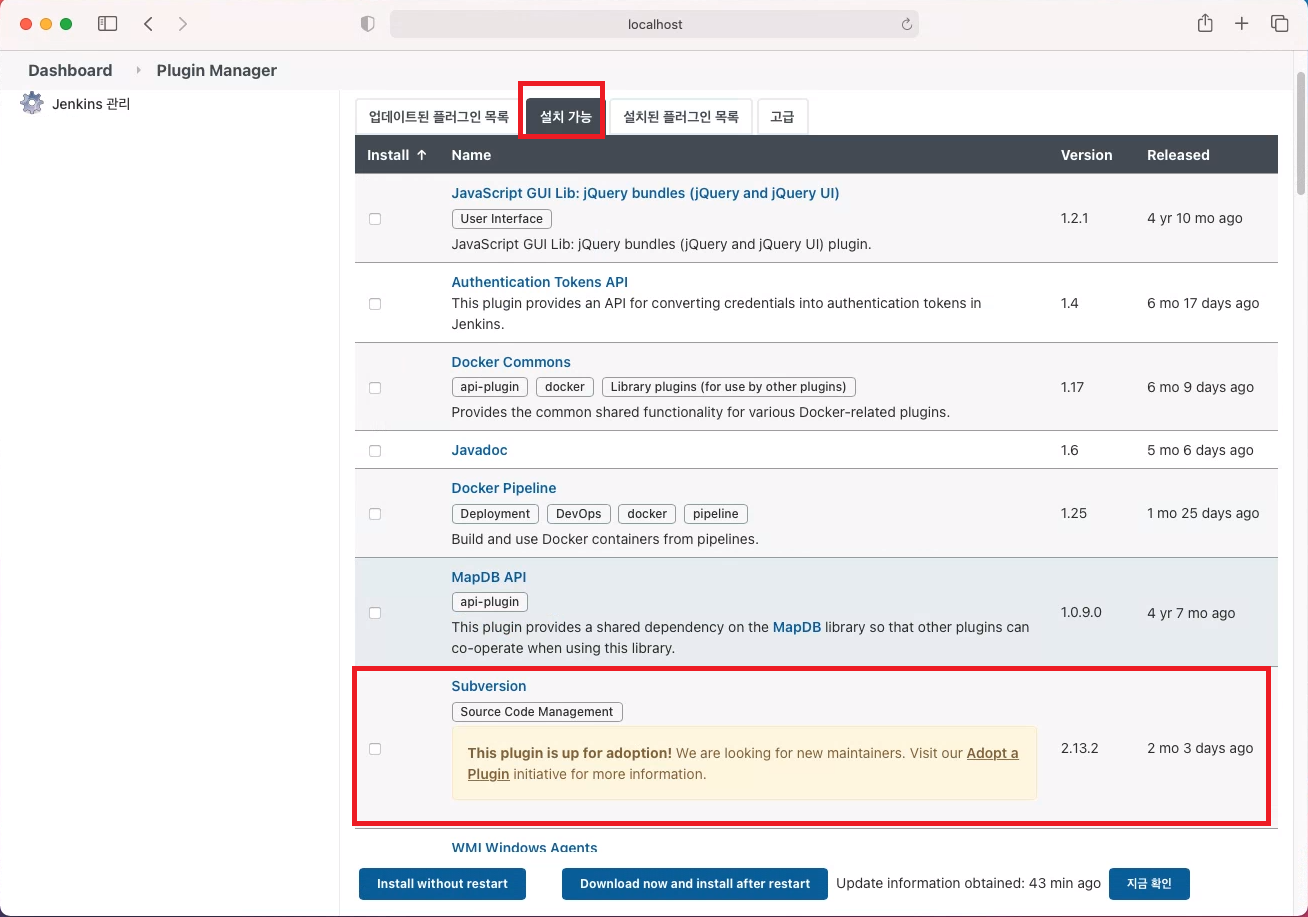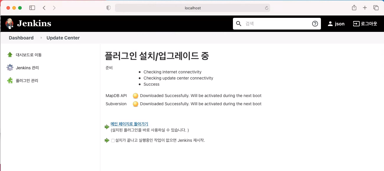 다운로드 완료 후 "설치가 끝나고 실행중인 작업이 없으면 Jenkins 재시작." 선택