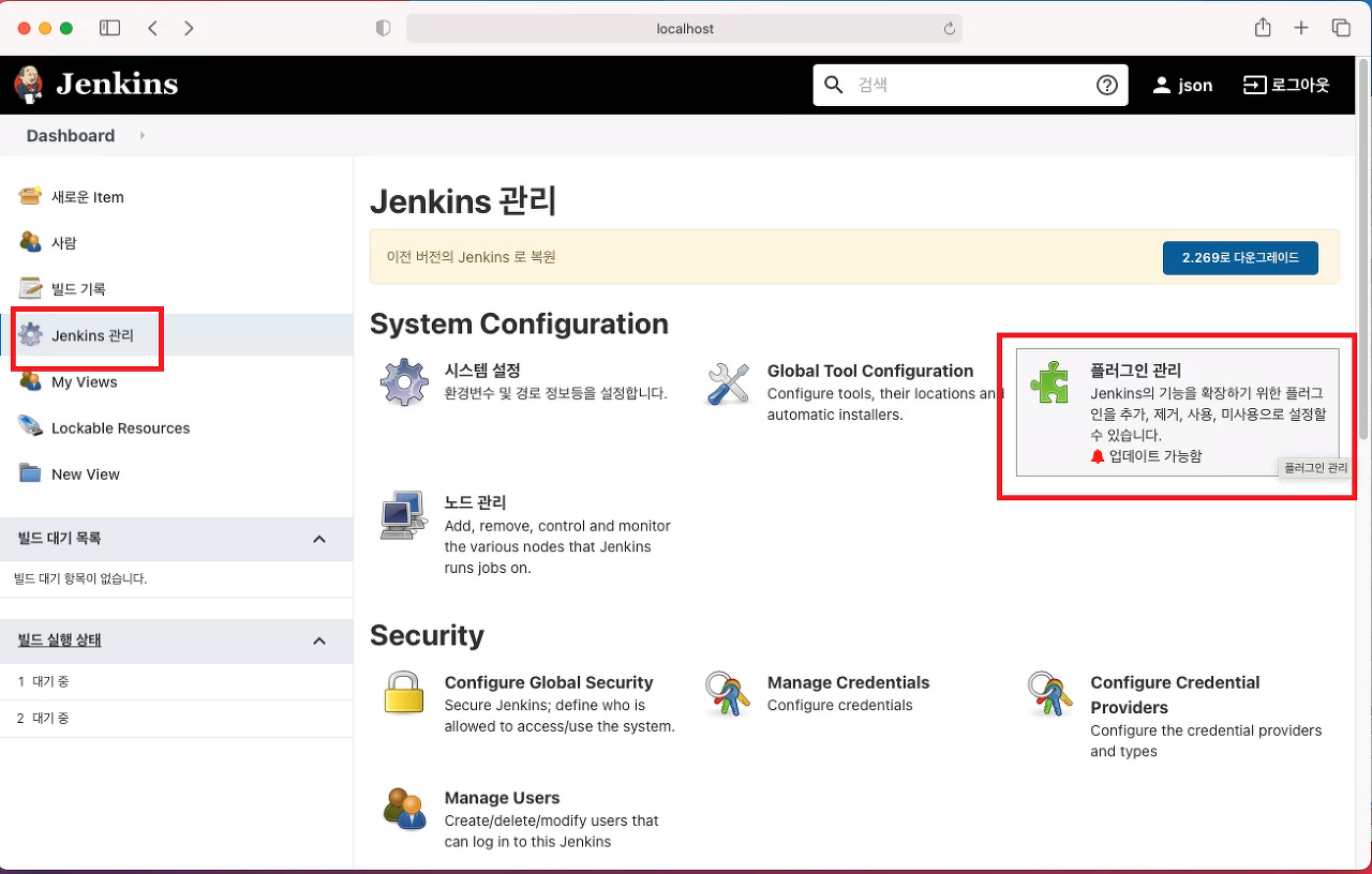 1. 메인 화면 Jenkins 관리 -> 플러그인 관리