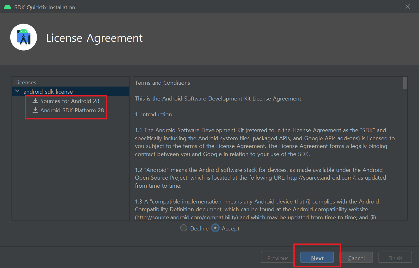 License for package Android SDK Platform 28 not accepted.