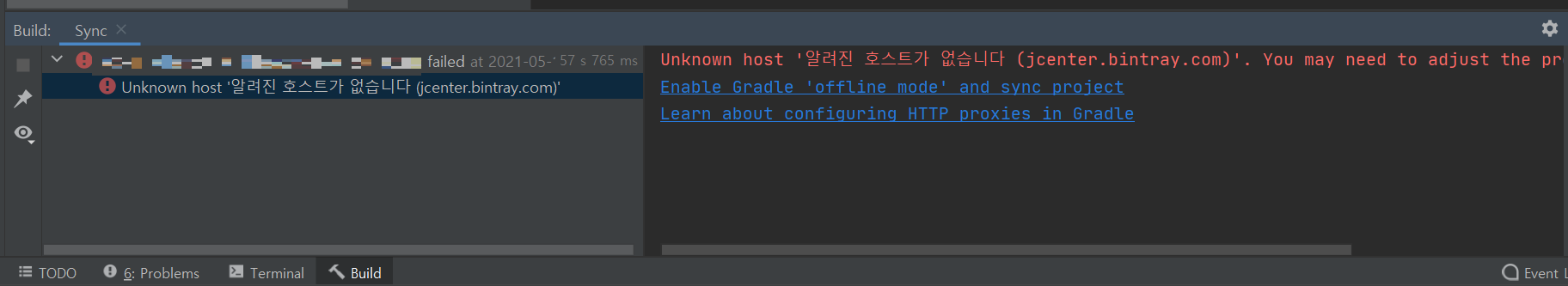 Unknown host '알려진 호스트가 없습니다 (jcenter.bintray.com)'. You may need to adjust the proxy settings in Gradle.