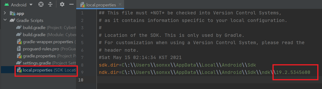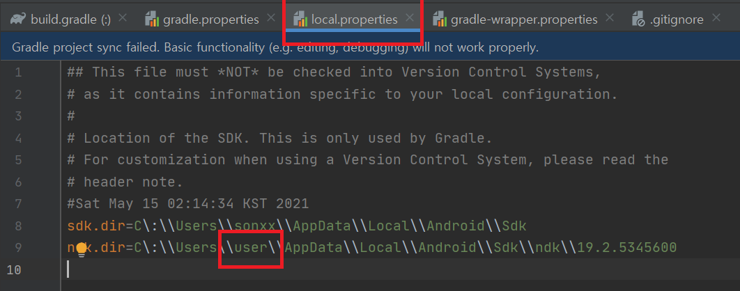 ex) ndk.dir=C\:\\Users\\sonxx\\ -> ndk.dir=C\:\\Users\\