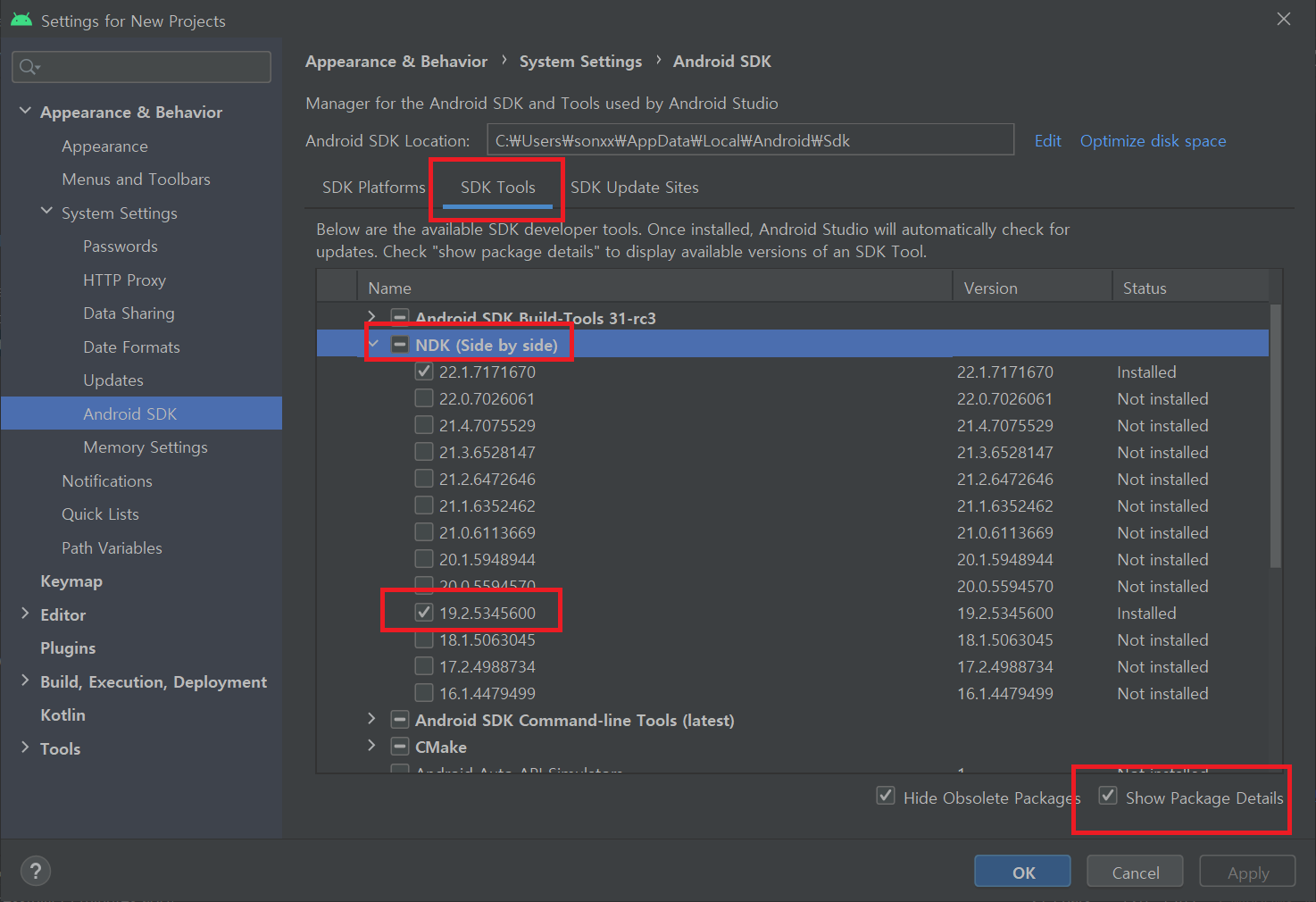 SDK Tools 탭 -> Show Package Details -> NDK (Sdie by side)
