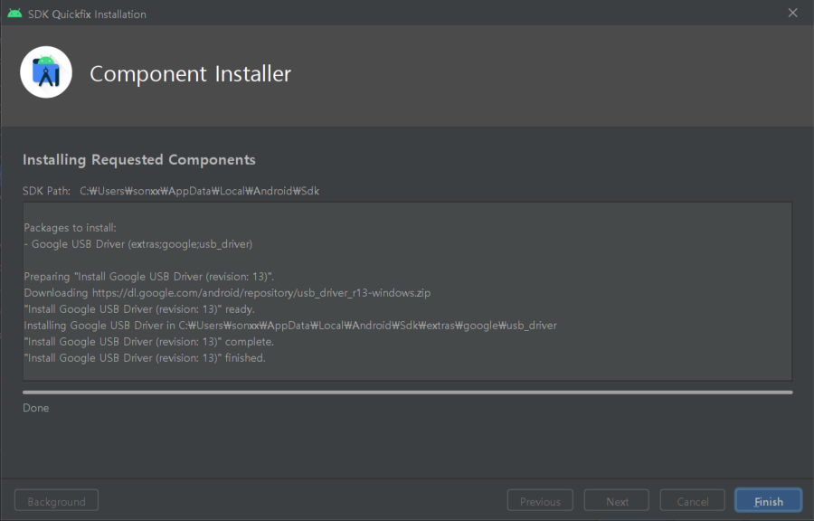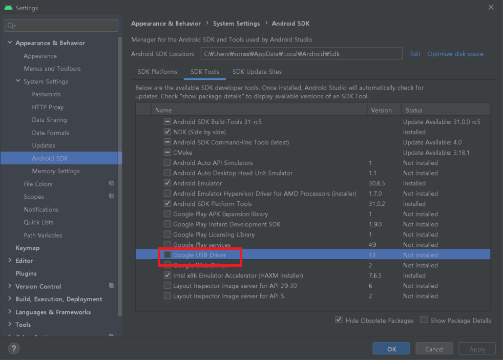 - SDK Tool 탭 -> Google USB Driver 선택 후 설치