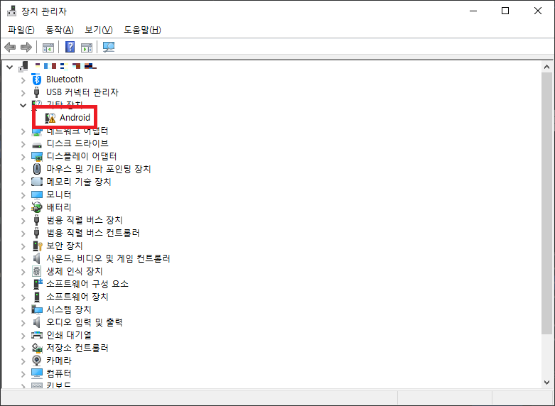 - 기타 장치 Android 드라이브 업데이트 및 삭제 후 재 설치 후에도 인식 되지 않음.