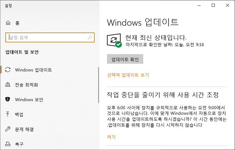 - 윈도우 업데이트 화면 진입 후 업데이트 확인 진행