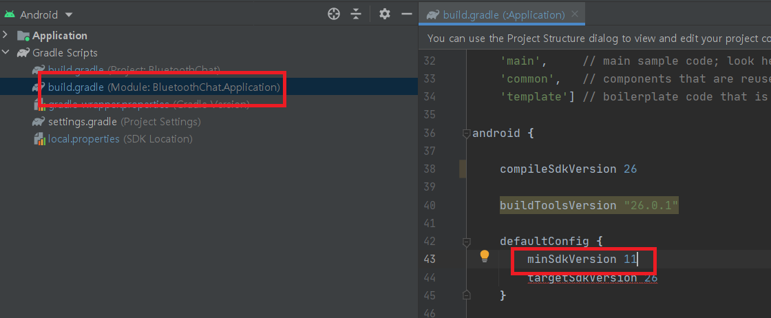 수정 방법 : build.gradle minSdkVersion 변경 (appcompat-v7:26.1.0 경우 min SDK 14로 변경 필요)