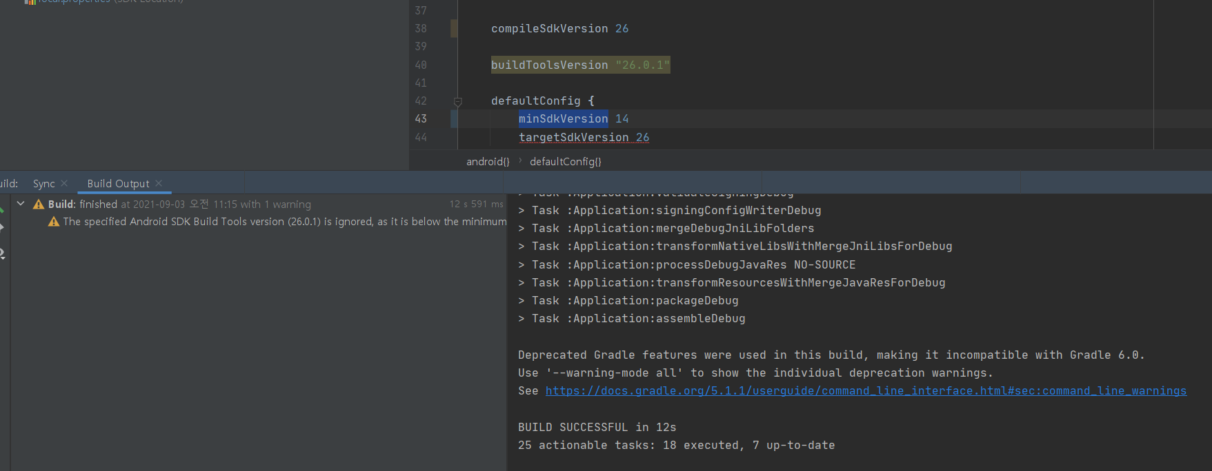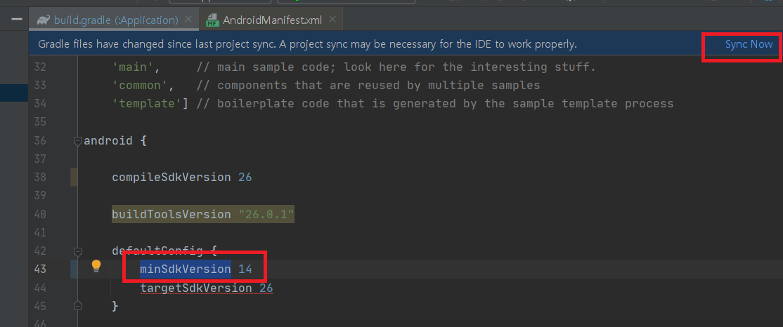 minSdkVersion 14 변경 후 오른쪽 상단 Sync Now 실행
