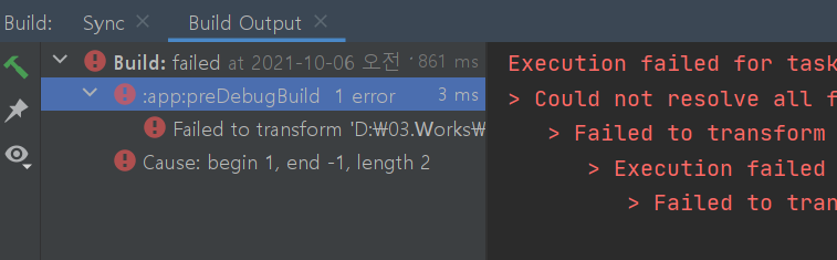 빌드 에러 : using Jetifier. Reason: begin 1, end -1, length 2