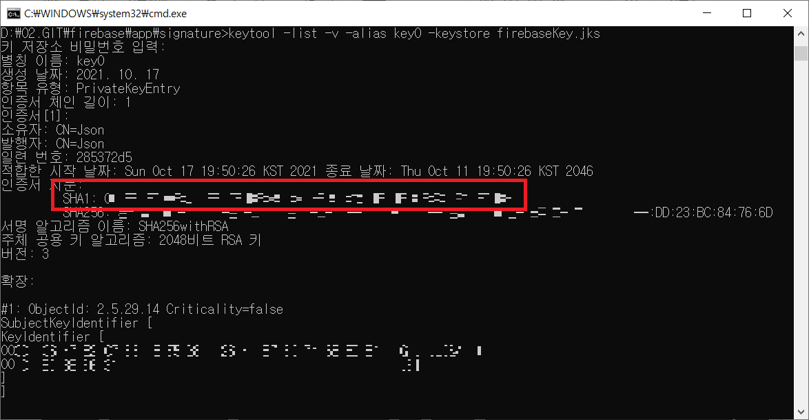 명령어 : keytool -list -v -alias key0 -keystore firebaseKey.jks