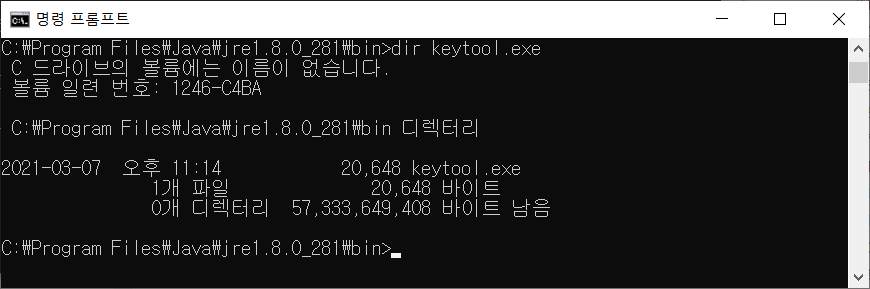keytool 위치 : C:\Program Files\Java\jre1.8.0_281\bin