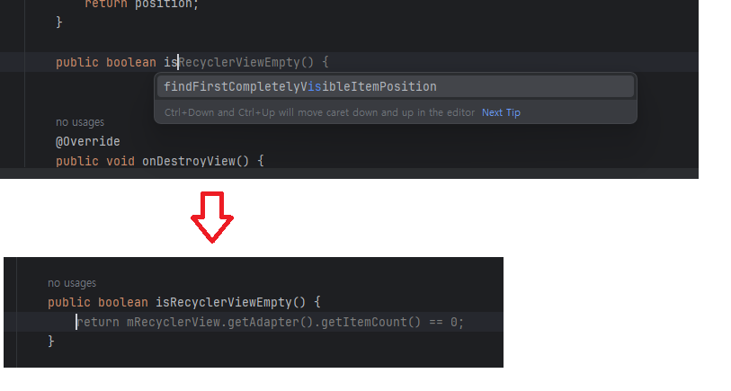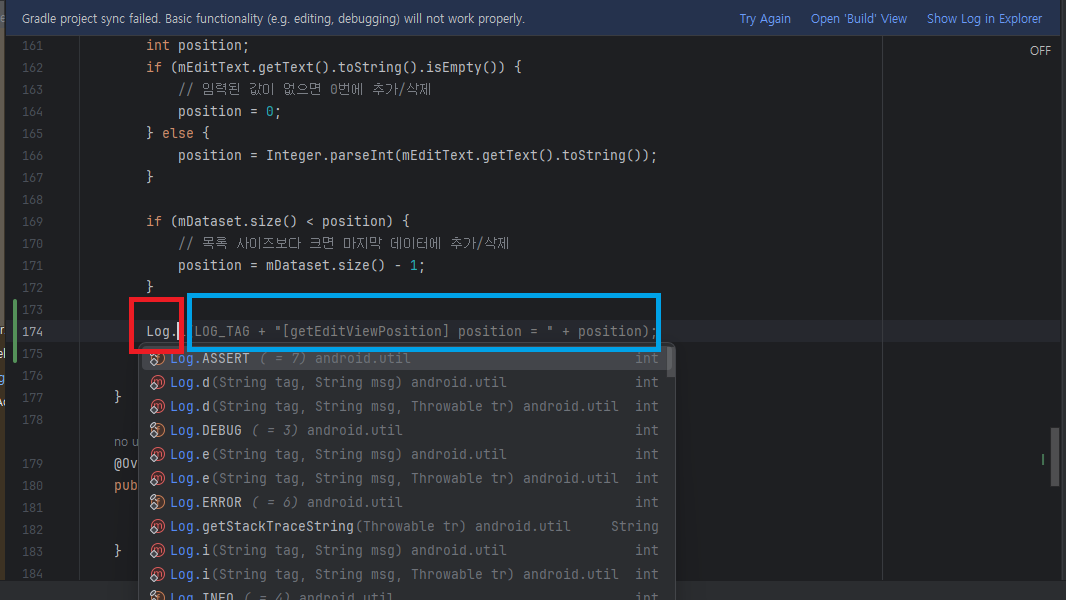 로그 코드 추천: 함수 하단 Log 까지만 입력하기 기다릴 경우 아래 파랑색 부분과 같이 함수명 + 변수명까지 추가해서 코드 생성 (Log 입력 후 코드 추천 받은 후 Tab 키를 입력 할 경우 코드 완성)