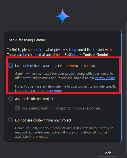 4. Gemini가 현재 작업 중인 프로젝트의 컨텍스트(코드, 파일 등)를 사용하여 더 정확한 답변과 추천을 제공 할 수 있게 "Use context from your projects to improve responses" 선택