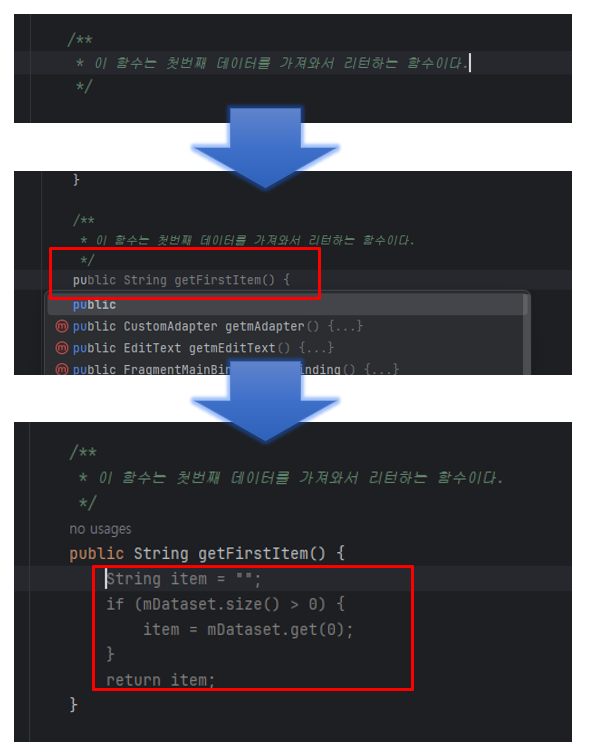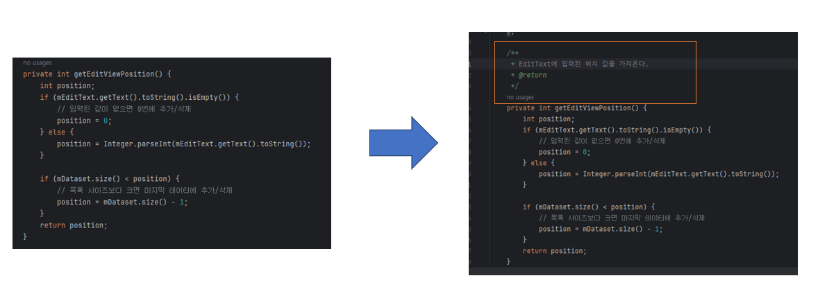 함수 상단 아래와 같이 기본 주석만 생성 할 경우 함수 동작에 맞는 주석 설명이 자동 추가 됨.