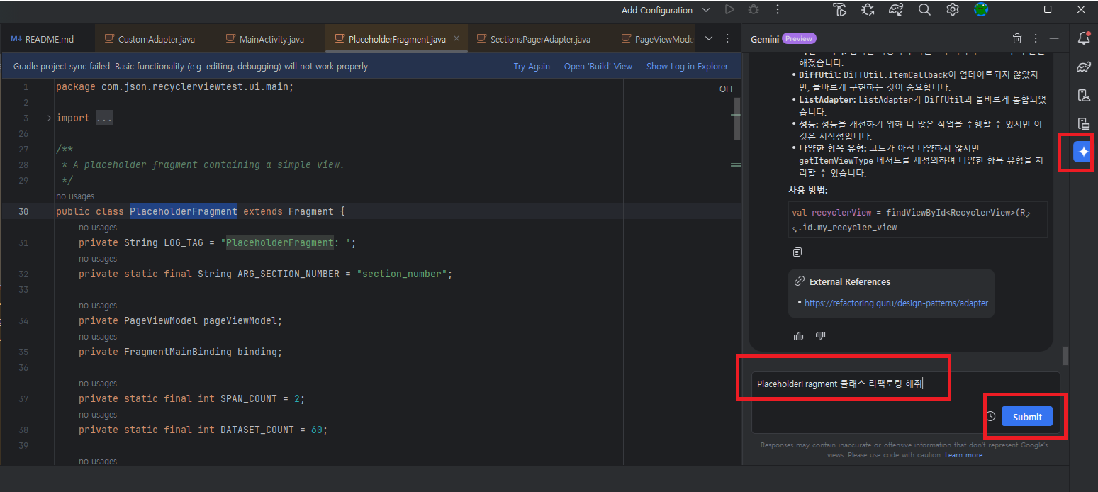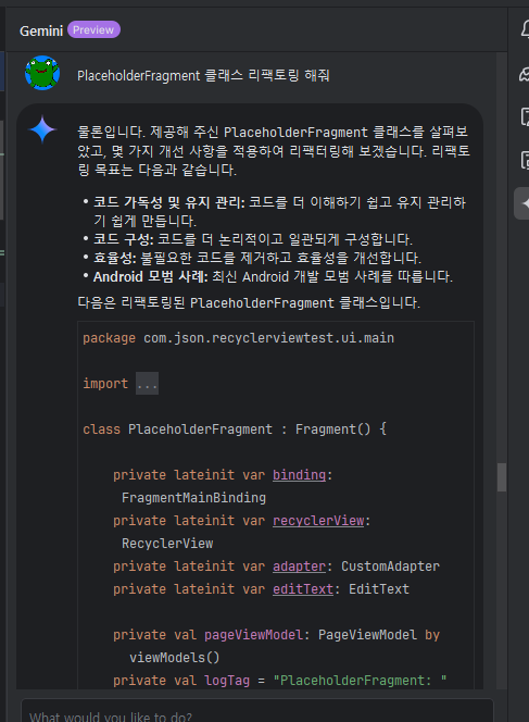 Gemini 채팅 창에 "XXX 클래스 리팩토링 해줘" 입력 후 Submit 버튼 누름