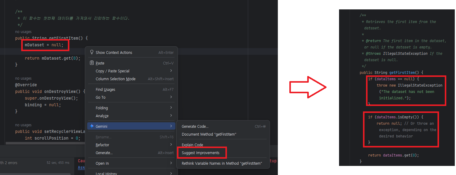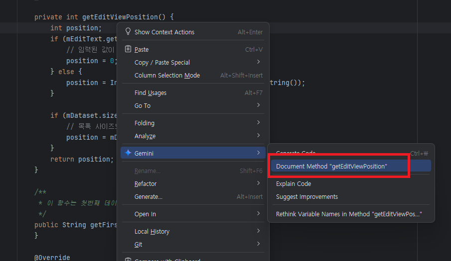 함수 -> 마우스 우클릭 메뉴 -> Gemini -> Document Method "함수명" 선택