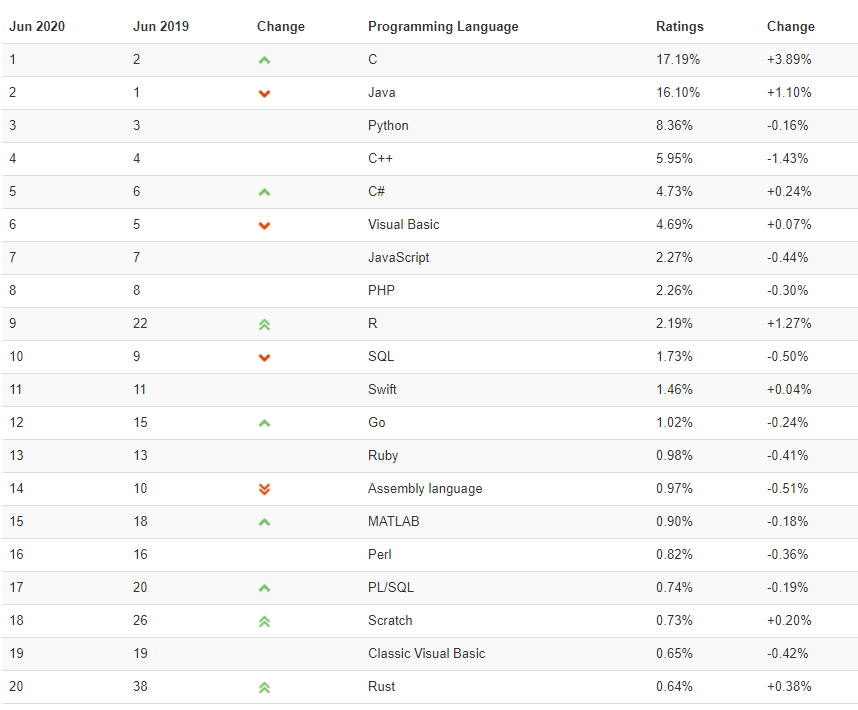 2020년 프로그램 언어 순위 TIOBE