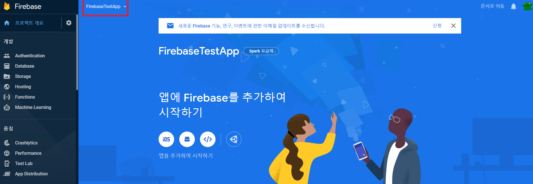 - 왼쪽 표시되는 개발, 품질 및 애널리틱스 등 Firebase에서 제공되는 서비스를 사용 가능.