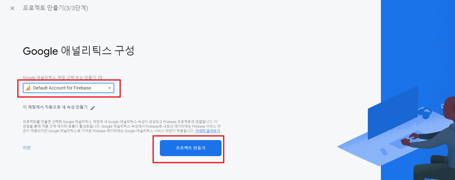 - Default Account for Firebase 선택하여 자동으로 새 속성으로 프로젝트 만들기