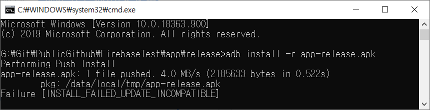 G:\Git\PublicGithub\FirebaseTest\app\release>adb install -r app-release.apk Performing Push Install app-release.apk: 1 file pushed. 4.0 MB/s (2185633 bytes in 0.522s) pkg: /data/local/tmp/app-release.apk Failure [INSTALL_FAILED_UPDATE_INCOMPATIBLE]