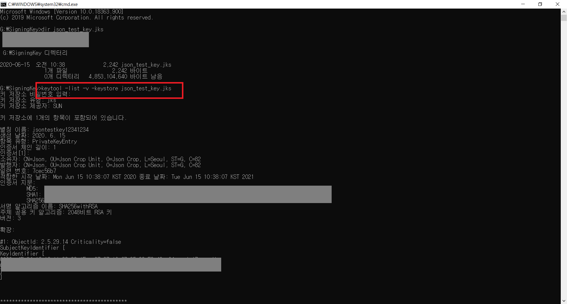keytool -list -v -keystore [사이닝키 이름]