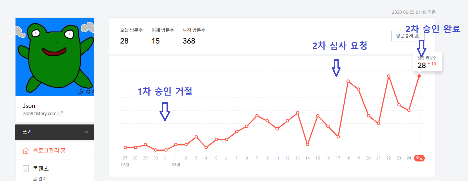 1차 승인 거절 시점에서는 총 게시글과 평균 조회수 모두 "컨텐츠 부족" 거절 사유가 누가나 납득 할 수 있는 결과라고 생각합니다.