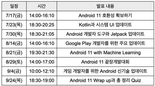 2020년에는 Android 11 Meetup은 온라인 심층 세미나 및 커뮤니티 이벤트로 오는 7월 17일부터 9월까지, 총 8회에 걸쳐 진행 예정