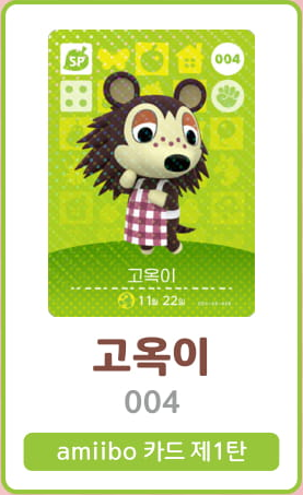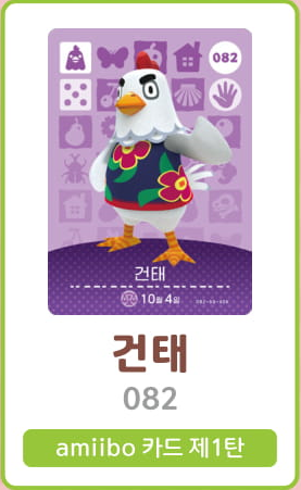 희망소비자가격: 3500원 발매일: 2020-03-20 1팩당 카드 3장/제1탄 총 100종류 (무작위) 아미보 카드 주민 목록 001 여울 002 너굴 003 DJ K.K 004 고옥이 005 갑돌 006 도루묵씨 007 무파라 008 콩돌이 009..