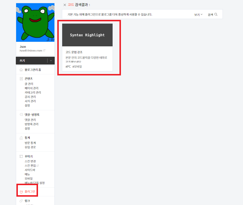 티스토리 설정 -> 플러그인 -> Syntax Highlight