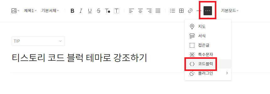 블로그 상단 "..." 선택 -> 코드블럭