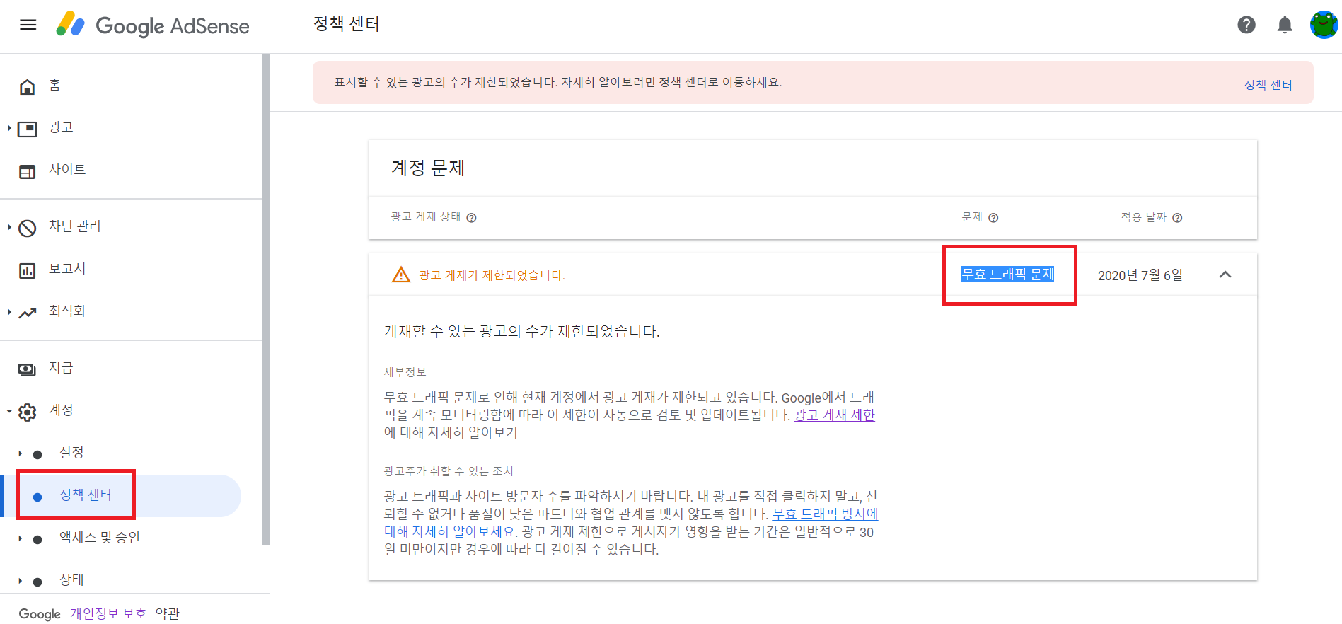 계정 -> 정책 센터 -> 계정 문제 (무효 트래픽 문제)