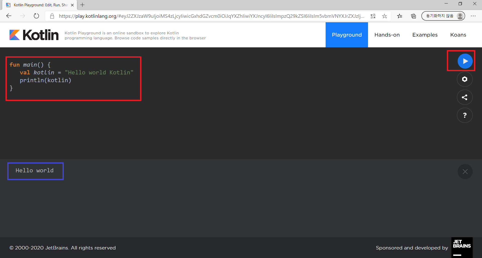 Jetbrains에서 Kotlin 대중화를 위해 아래와 같이 별도 프로그램 없이 Kotlin 코드를 작성하여 컴파일 후 결과를 확인 할 수 있는 사이트를 제공 하고 있다.