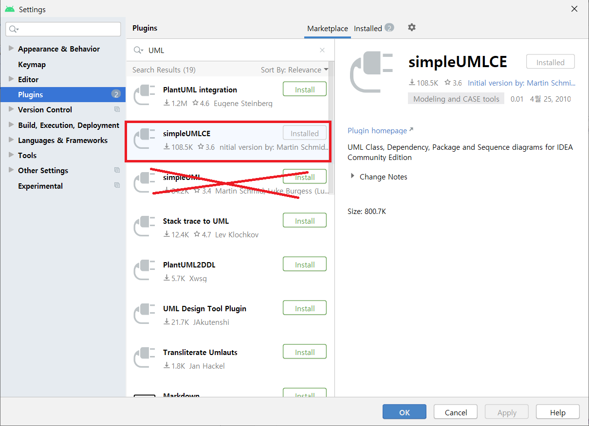 - Plugins -> Marketplace 탭 선택 -> UML 검색 -> 검색 목록에 simpleUMLCE 선택 후 Install -> Install 완료 후 Android Studio 재시작