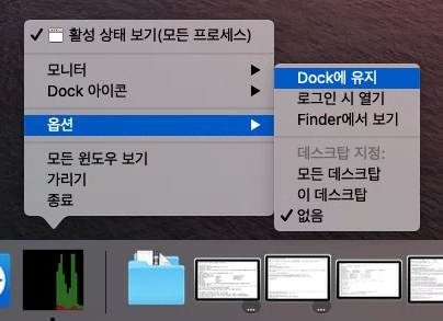 - 옵션 -> Dock에 유지